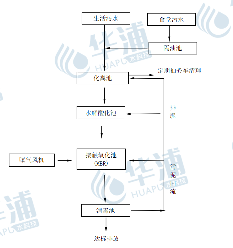 根據進水水質、水量及排放標準和建設單位提供的施工要求,分析對比現有各種污水處理技術的特點,同時結合我方大量的同類工程設計施工經驗,確定本工程采用地埋式一體化設備,主要工藝采用A/O+MBR,該技術在確保出水穩定達標的基礎上,運行維護簡單方便。